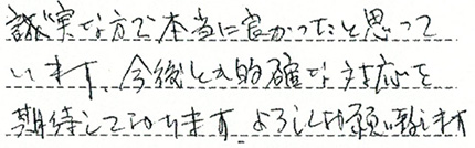 誠実な方で本当に良かったと思っています。今後とも的確な対応を期待しております。よろしくお願い致します。