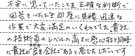 不安に思っていたことを正確な判断で回答をいただき即座に見積、迅速な作業で大変満足のいくものでした。