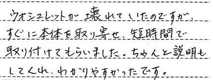 ウォシュレットが壊れていたのですが、すぐに本体を取り寄せ、短時間で取り付けてもらいました。ちゃんと説明もしてくれ、わかりやすかったです。
