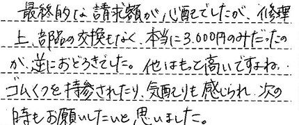 最終的な請求額が心配でしたが、修理上、部品の交換もなく、本当に3000円のみだったのが、逆におどろきでした。他はもっと高いですよね。ゴムくつを持参されたり、気配りも感じられ、次の時もお願いしたいと思いました。