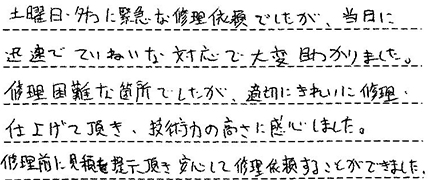 土曜日、夕方に緊急な修理依頼でしたが、当日に迅速でていねいな対応で大変助かりました。修理困難な箇所でしたが、適切にきれいに修理・仕上げて頂き、技術力の高さに感心しました。修理前に見積を提示頂き安心して修理依頼することができました。