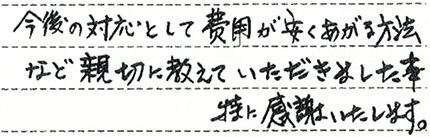 今後の対応として費用が安くあがる方法など親切に教えていただきました事特に感謝いたします。