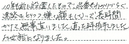 10年も前に設置したもので、品番もわかりづらく、連絡をとりつつ嫌な顔もしないで、長時間かけて無事直りました。直った時拍手しました。
